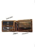 The wallet includes 6 card slots, 1 transparent ID window, 1 coin pocket with flap, 2 currency compartments, and a secure zipper section for added safety. Built-in RFID protection ensures your cards remain safe from wireless theft. The rich distressed finish not only looks unique but adds a classic charm to your personality.